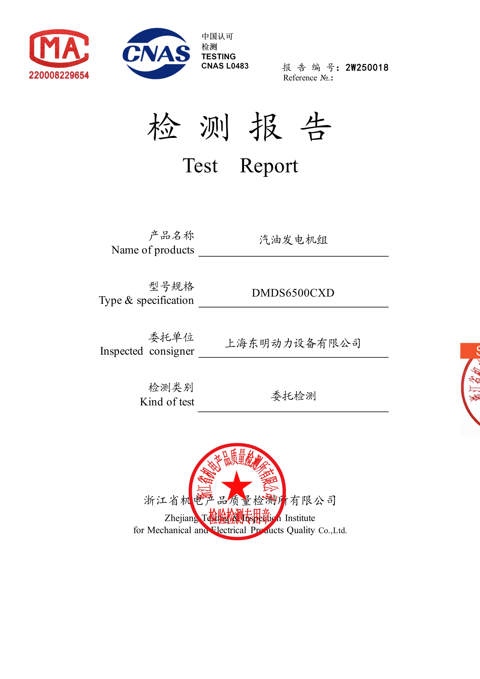 作為專業發電設備,上海東明 DMDS65000CXD 已通過檢測機構浙江省機電產品質量檢測所檢測認證,具備完整的檢測報告,在品質把控上表現突出: